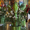 Fine glas med amaryllis, voksblomst og blåbærris. Fås med hhv. 2 eller 3 stilke i rød eller hvid.
